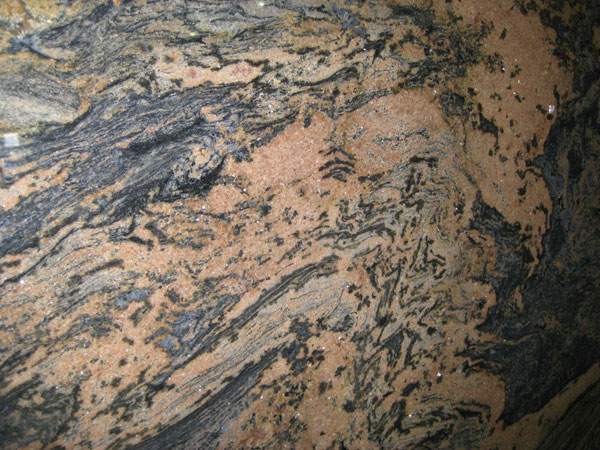 | Description: Swirled veins of terracotta and beige on navy blue and grey background. |